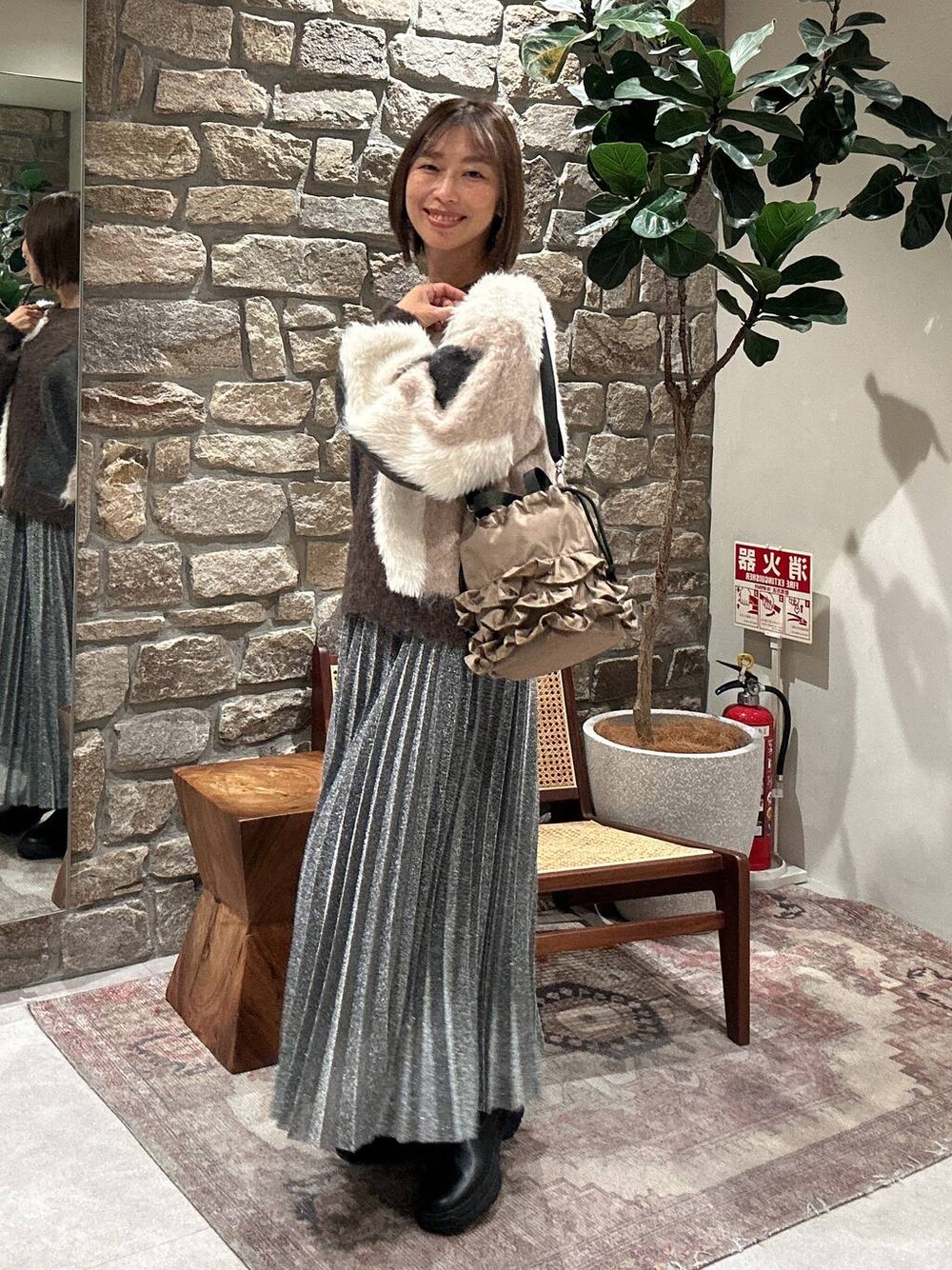 ニュアンスパターンニット♡ この色合いがまた可愛く、 プリーツスカートで女子力アップ ブーツにすることで、甘すぎず ブーツはセールにもなってますし、 リアルバイです👍 巾着バックも、可愛い❤️