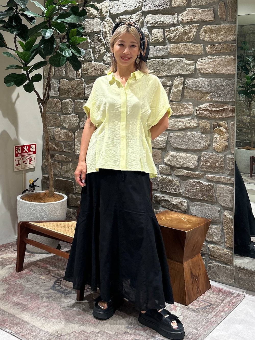 タックデザインBLに コットンリネンフレアスカートを あわせましたぁ! スカーフで遊び心♡ 夏らしい爽やかな黄色で気分もup