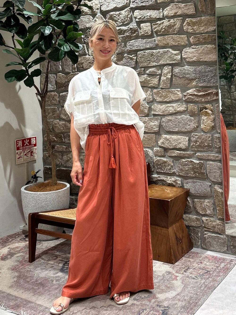 シアーワークシャツ♡ にワイドパンツ合わせは定番♡ テラコッタ可愛いです