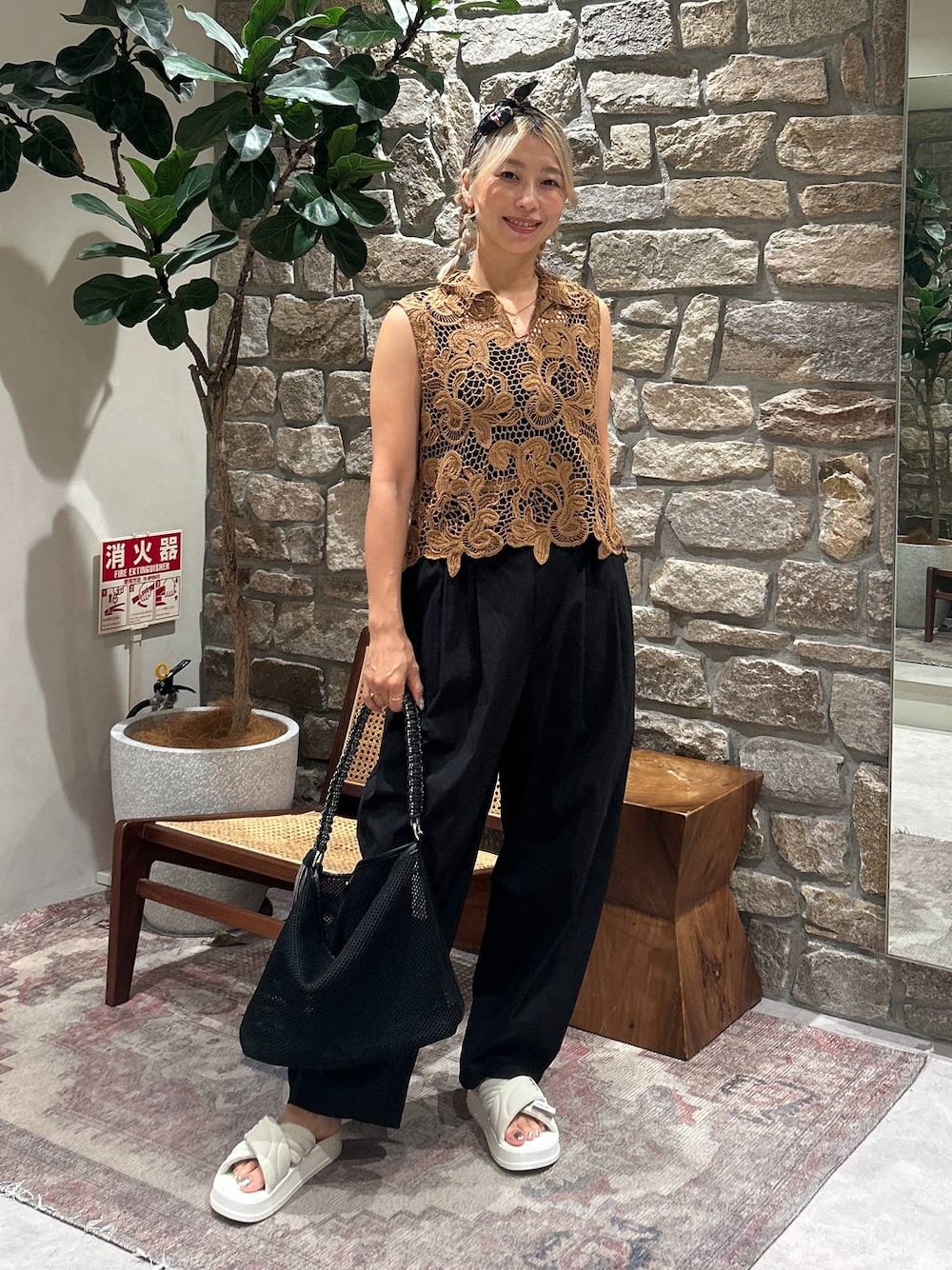 キーネックレースベスト とっても可愛いです♡ ボリュームコクーンパンツも 形が可愛く、 厚底サンダルはプーマの新作です。 ぜひ、サンダルもチェックしてください