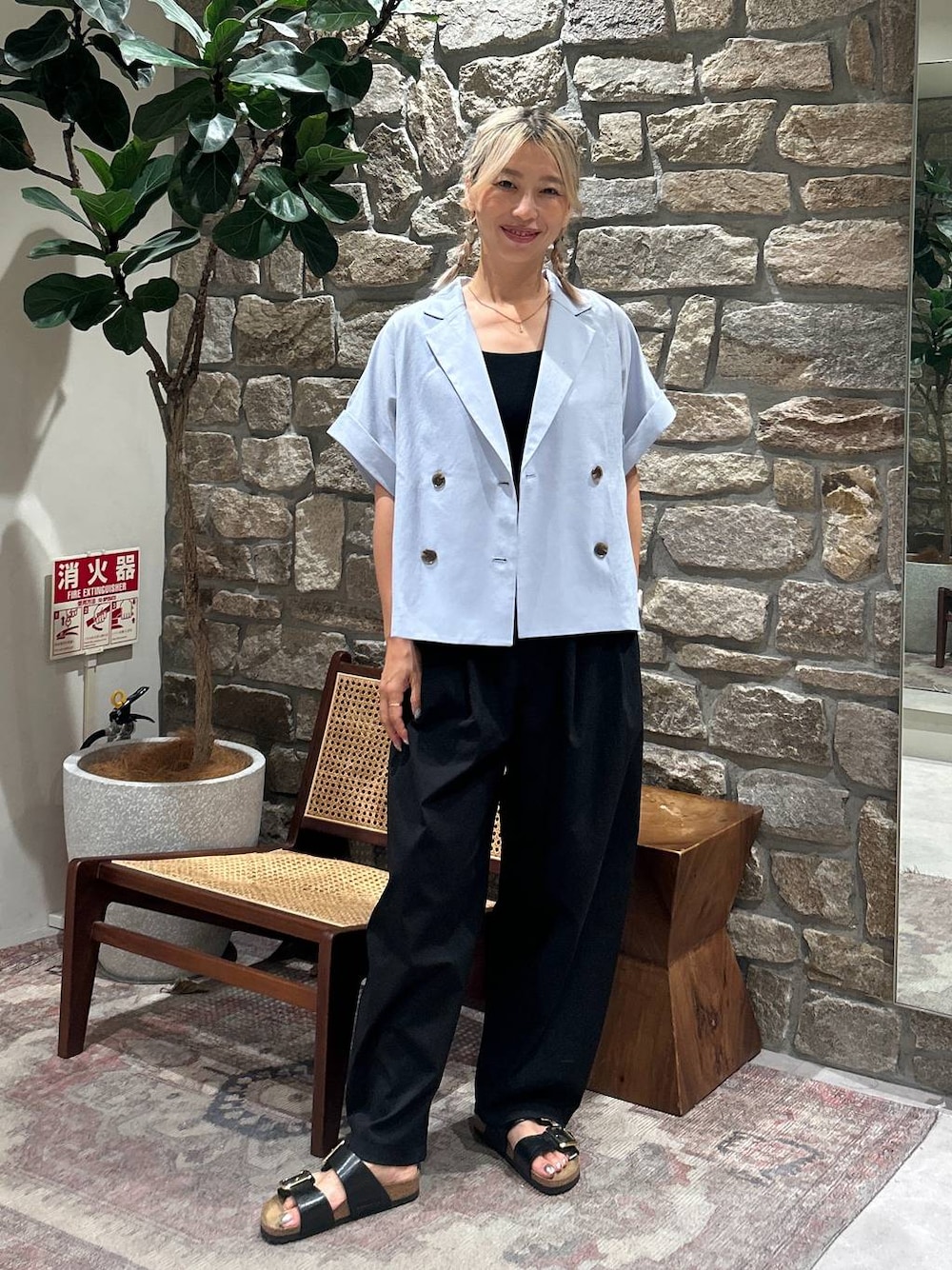 Fスリーブテーラードジャケット この色も可愛い😍 夏らしく爽やかに♡ シンプルコーデに差し色👍 ビルケンのサンダルは履き心地はバッチリ👌