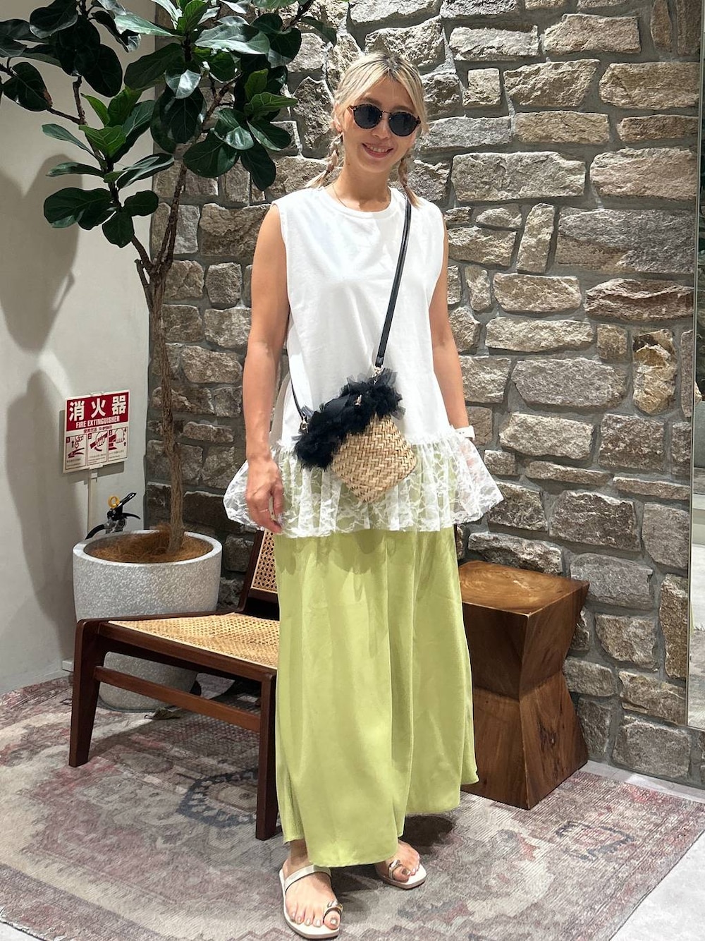 bfyuca(BAYFLOW イオンモール大高店)のかごバッグ「【kakatoo(カカトゥ)】チュールフリンジミニカゴバッグ」を使ったコーディネート