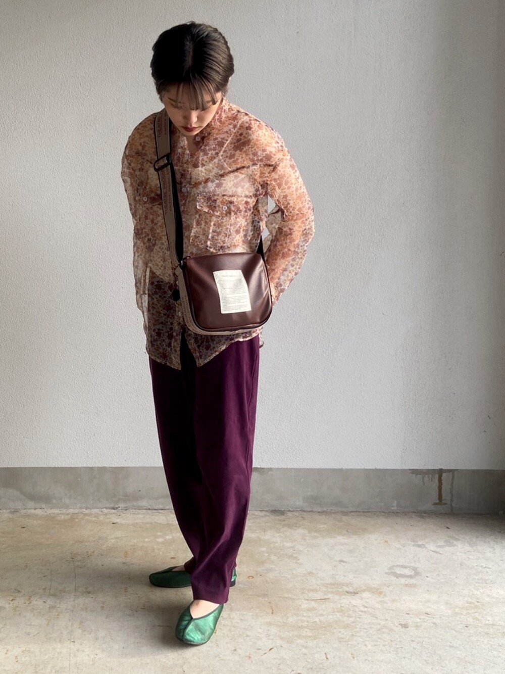 珍しい花柄のシースルーバンドカラーシャツに紫&グリーンの色遣いが楽しいコーデ🍇背中が広く開いたキャミソール&シースルーが最高にカワイイ〜〜🍂