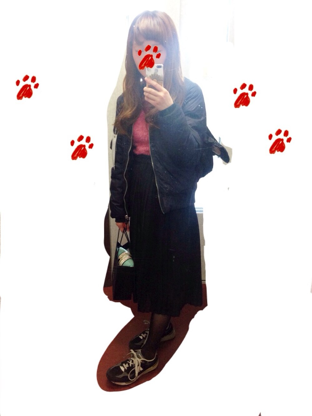 MA-1は、メンズサイズ(^.^)ネイビーネイビー(^.^ あとはお気に入りのシアターのぎょうざバッグ(^.^)かわいくて、家では飾っている☆ トップスは、ピンクのもけもけタートルネック(^.^)
