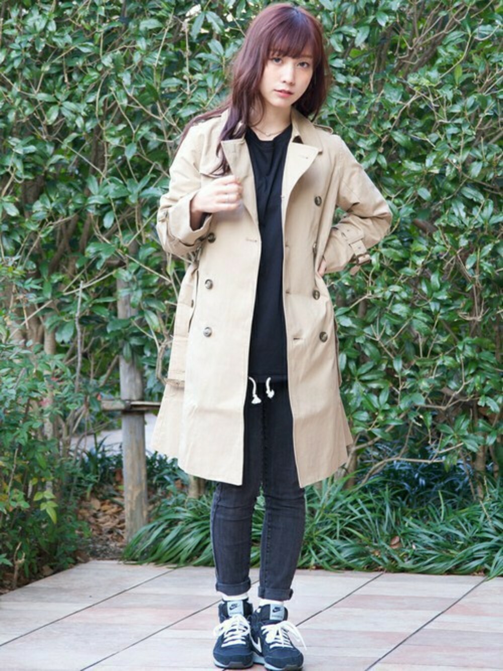 ベージュ×黒の落ち着いたコーデ。上がトレンチなのでTシャツとシーンズでカジュアルダウン。