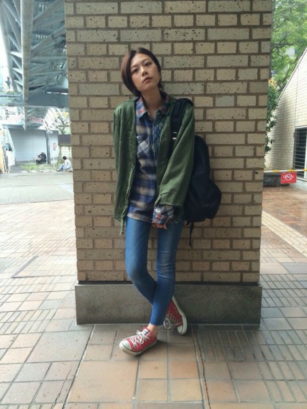 カーキとチェックに対する依存 テキトースタイリングには もっぱら赤コンバースで差し色を◎