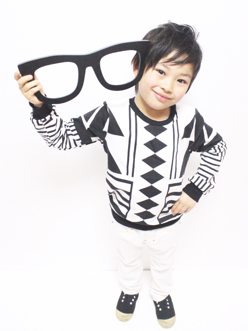 幾何学模様のトップス一枚でオシャレkidsに大変身٩(๑>∀<๑)۶ トップスの白とパンツの白。 トップスの黒と靴の黒。 を合わせてみました🎵