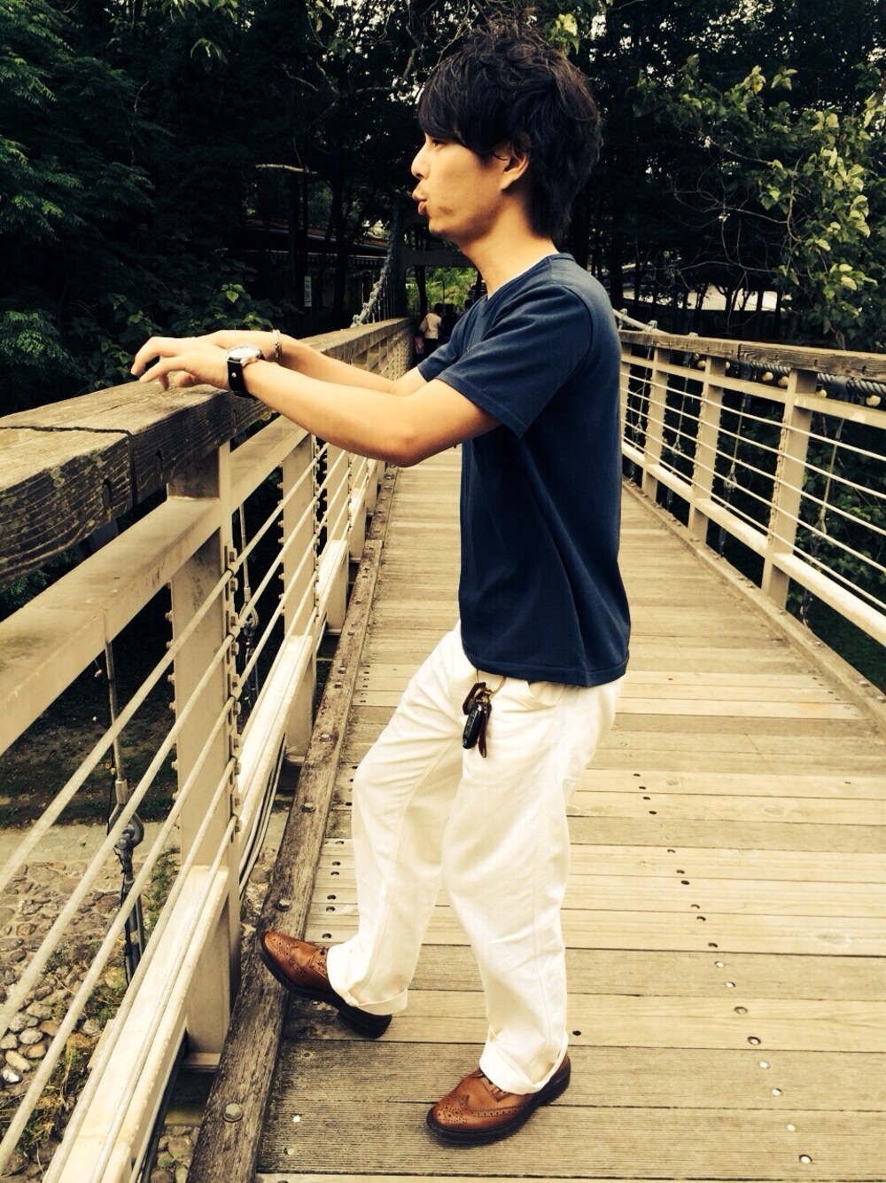 ブラウン系のドレスシューズを着用したメンズの夏コーディネートの1枚目の写真