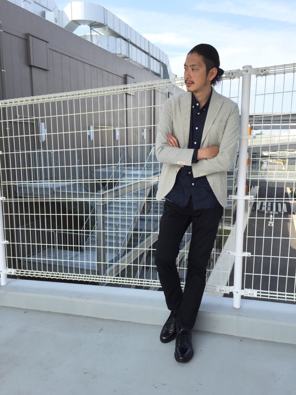 仕事で外出していた時のジャケットスタイルです。 この時期にジャケットを着る時は、暑苦しい感じにならないようにしています。 シアサッカーのジャケットは生地に凹凸があり、肌に触れる面積が少ないので、夏でも心地良く着れるので重宝しています♬