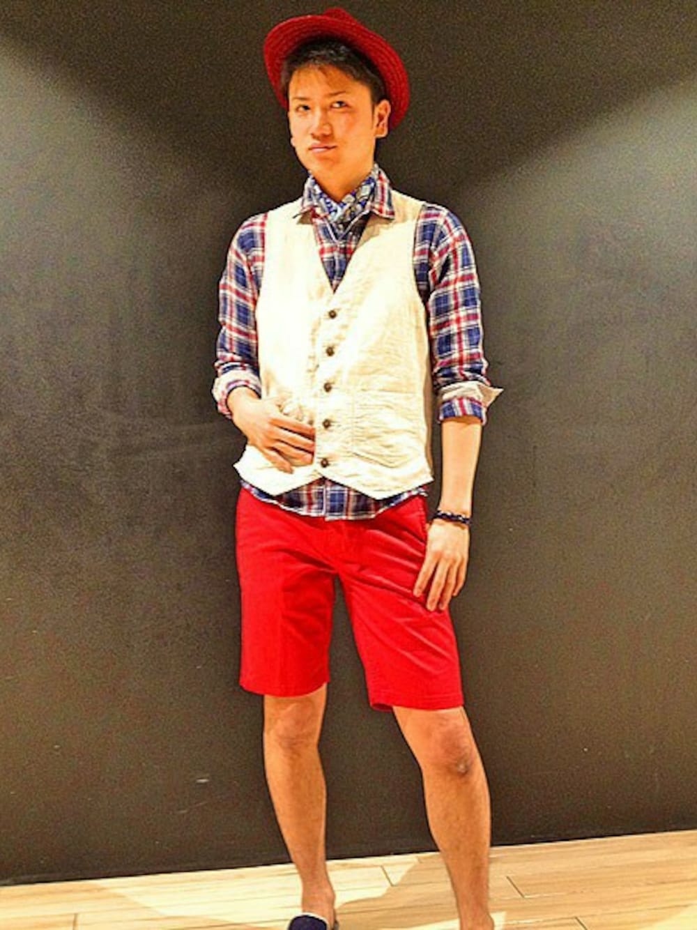 スマート5月号50Pで俳優の山本裕典さんが着用しているチノクロスショーツに フレンチリネンシャツを合わせ、ワークテイストな仕上がりにしました。 チェックシャツは人気のディティールある、襟ワイヤーとパラシュートボタンがアクセントになっています!!