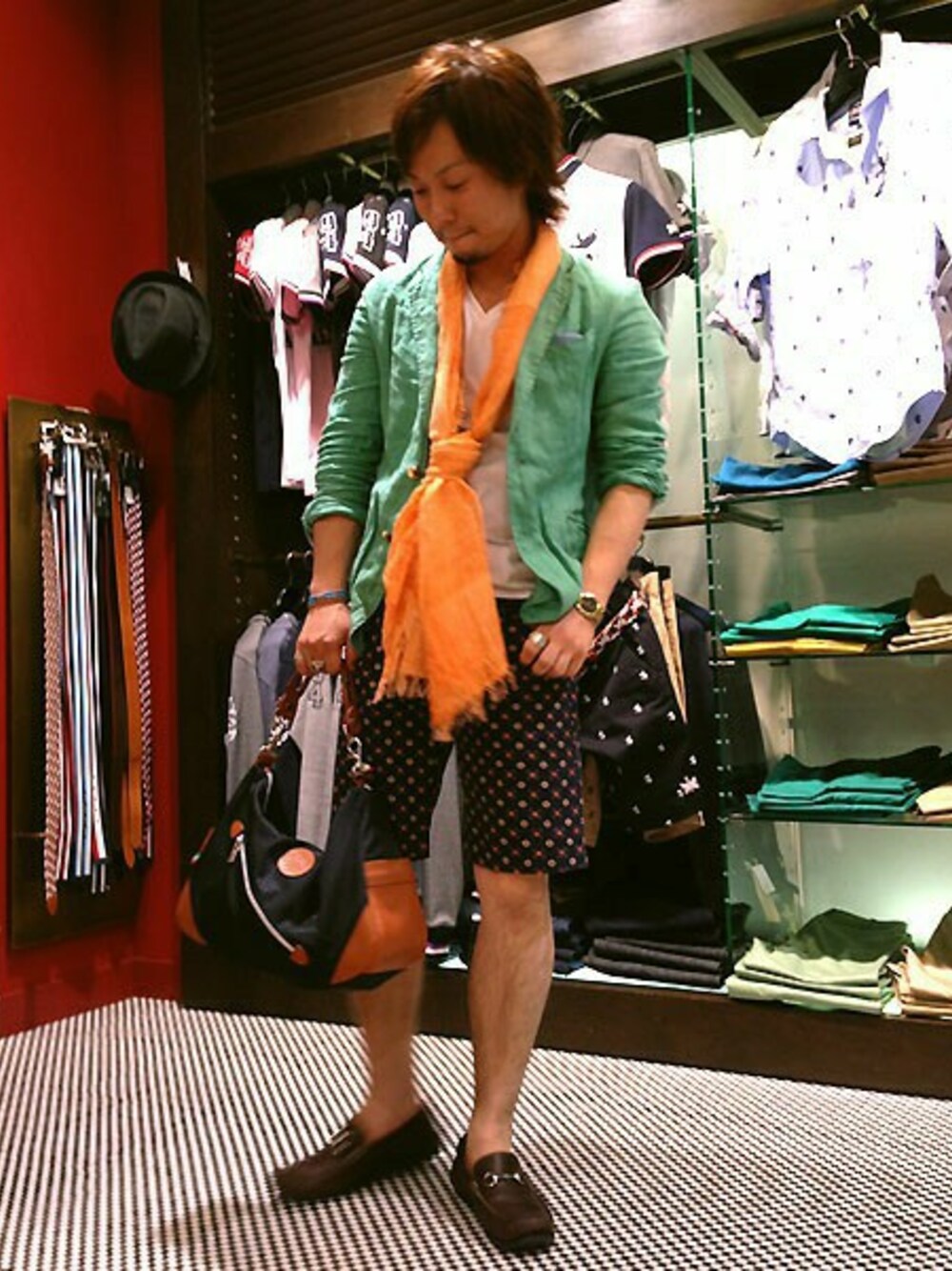 きれいなグリーンのジャケットは、 リネン素材を使用しているので通気性も良く軽やか。 柄入りの短パンとカッコ良くコーディネートしました!!