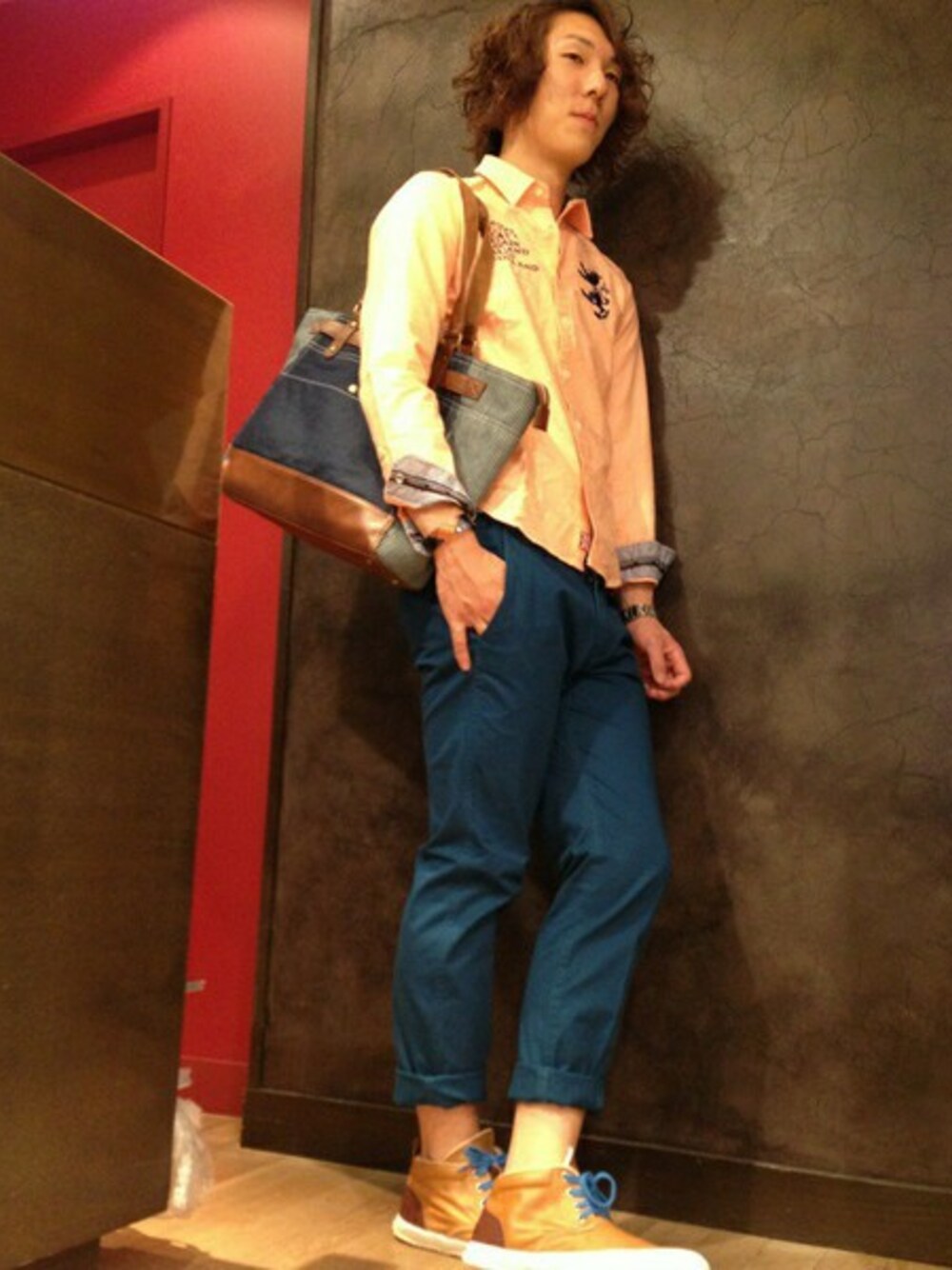 「アドミラル」の新作シャツとストレッチカラーパンツのコーディネート。 マカロニアンの靴紐をパンツに合わせてブルーに変えてみました!!
