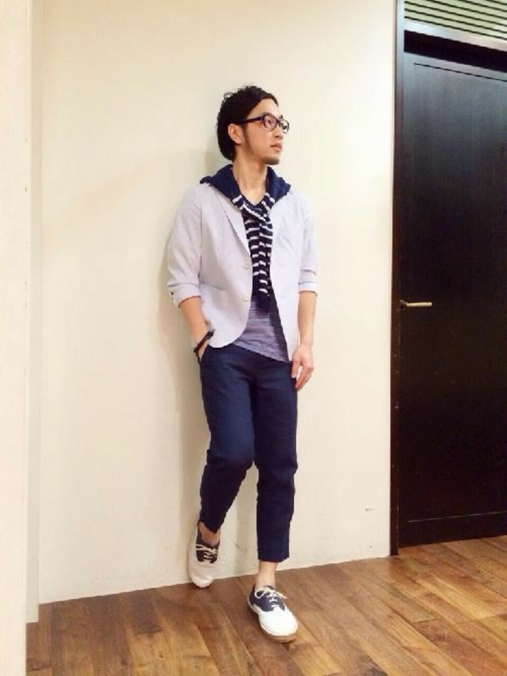 【初春のリラックスコーデ】 シアサッカーのジャケット、アンクルカットのパンツを使用したリラックスコーデです。 ボーダーニットのアクセントも春らしいコーデのワンポイントにオススメです!