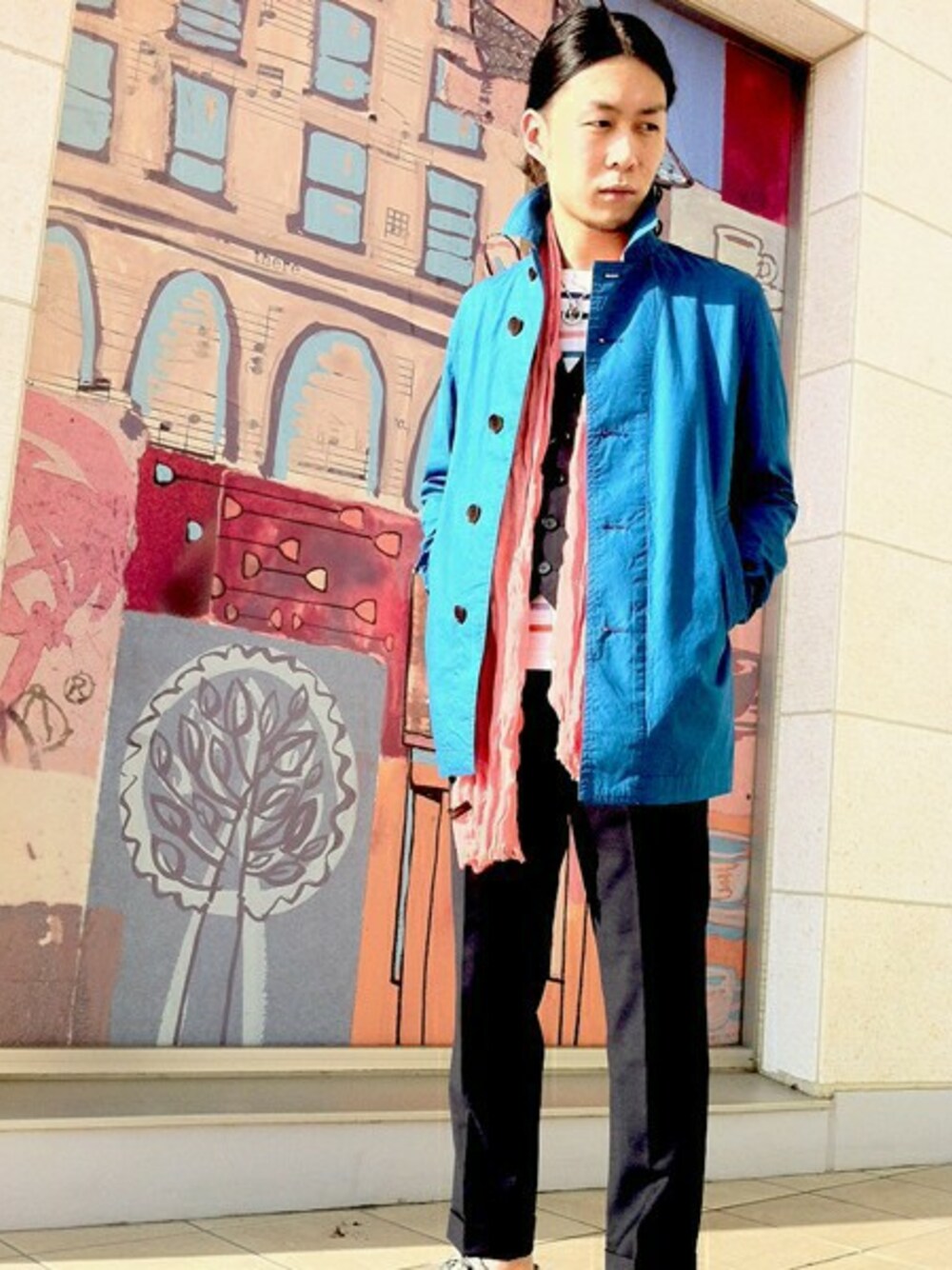 少し丈が短めで、ジャケット感覚で着れる鮮やかなショップコートをメインしたコーディネート。流行りのスプリングストールをピンクにして、春らしさを演出しました!!