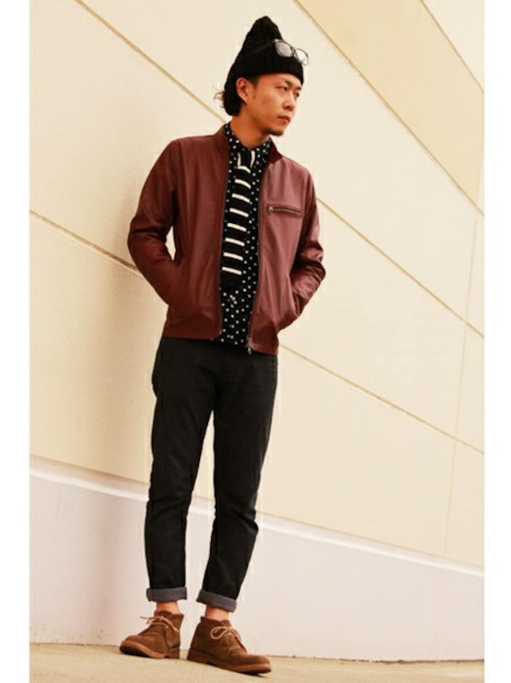 ハードなイメージのあるレザージャケットにドットシャツ&タイでモダンなコーデに。