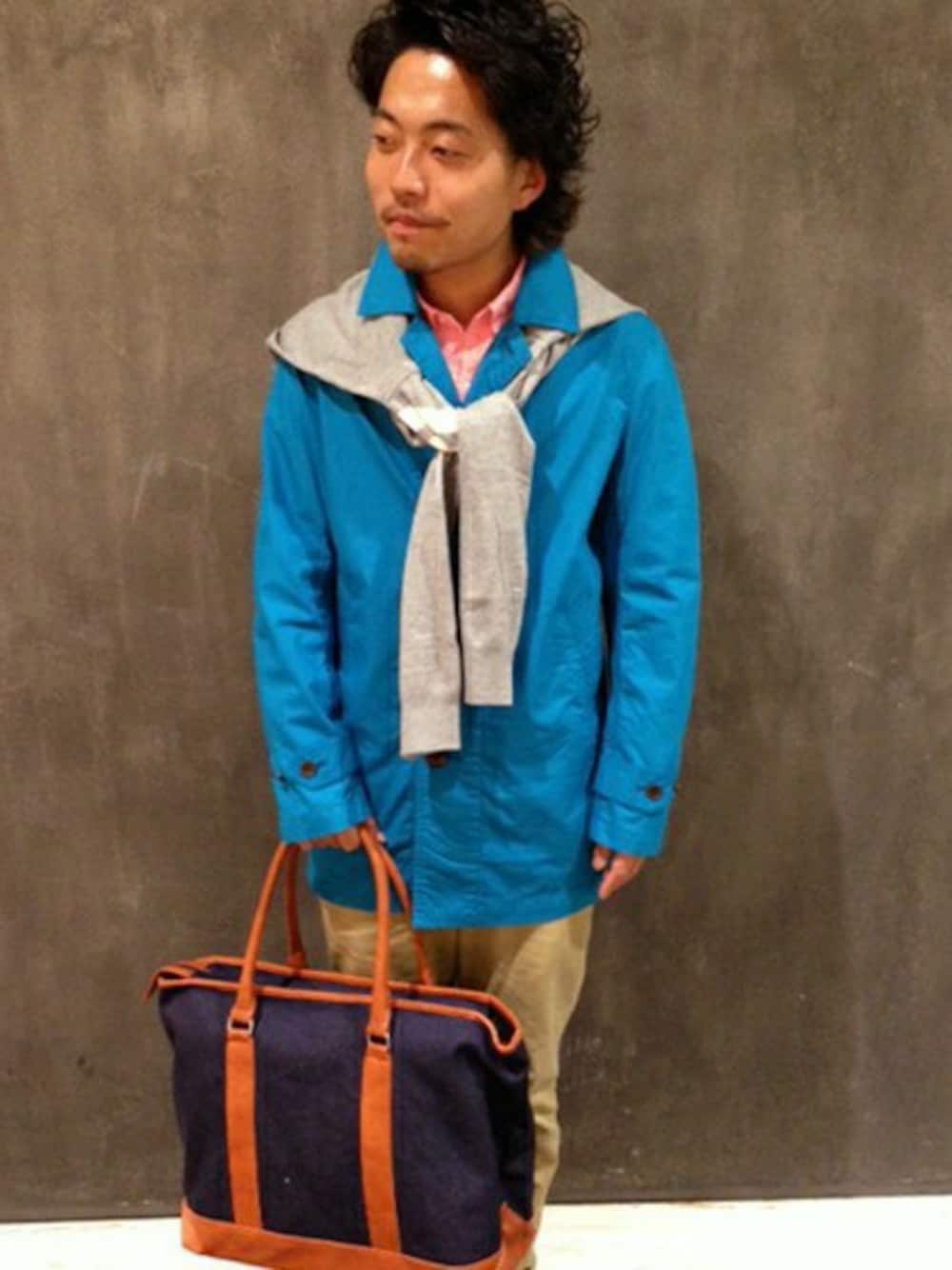 鮮やかなターコイズブルーのショップコート。インナーには相性に良いピンクをコーディネートしました。
