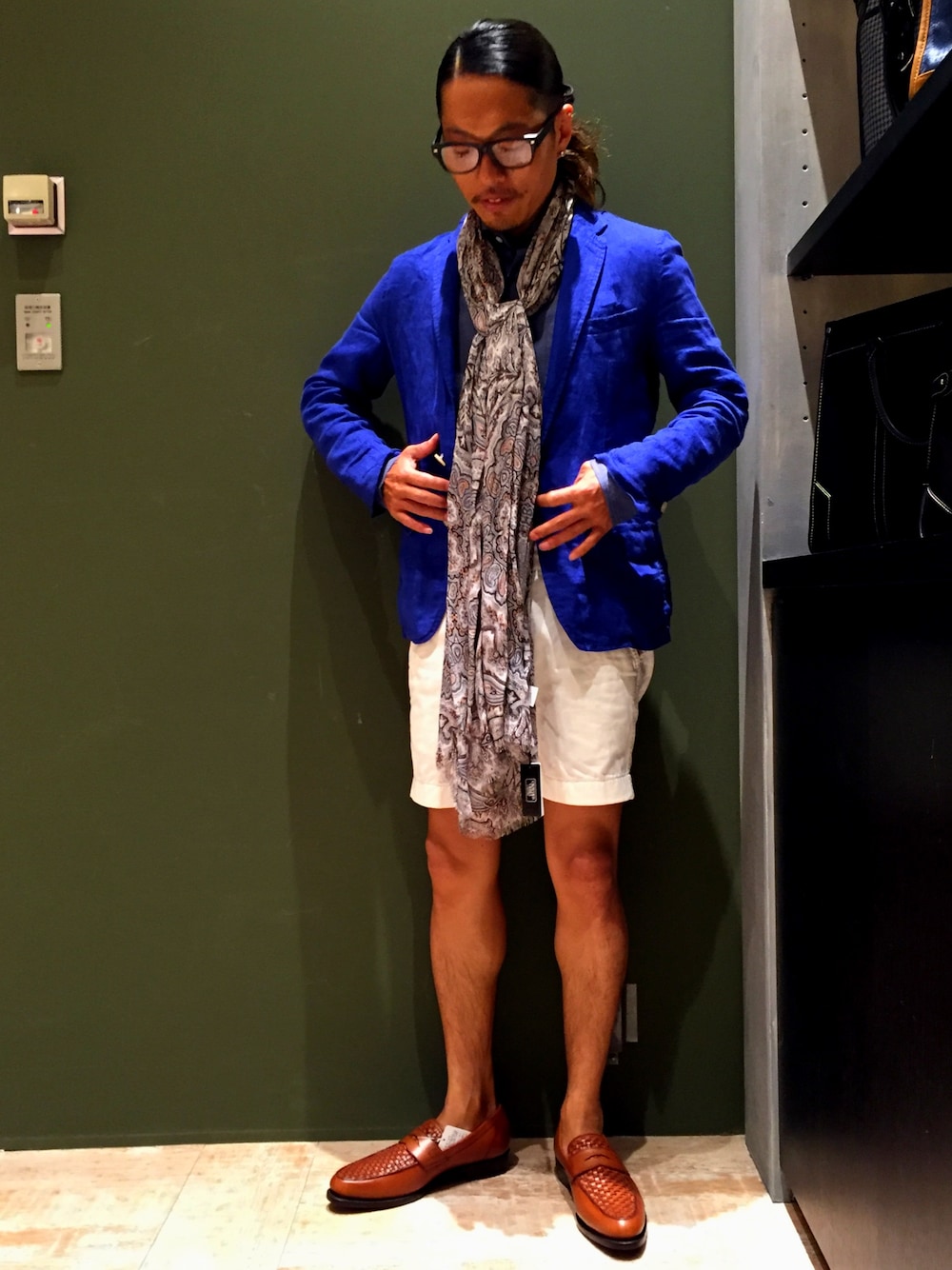 DAY OFF いつものビジネススタイルからパンツを変えストールをプラス。