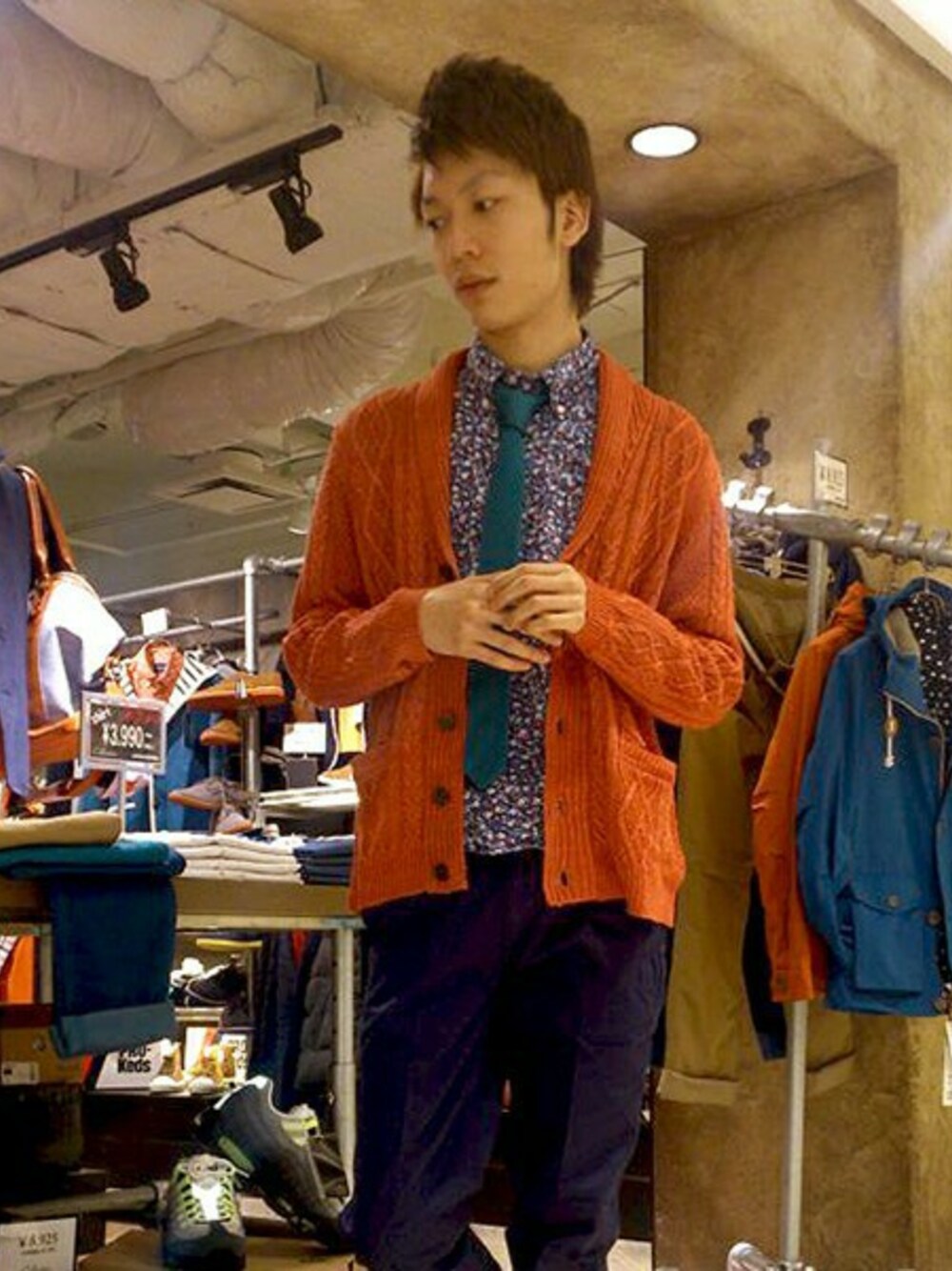 春を意識したオレンジのカーディガン。タイドアップしてジャケットっぽくコーデしました!!