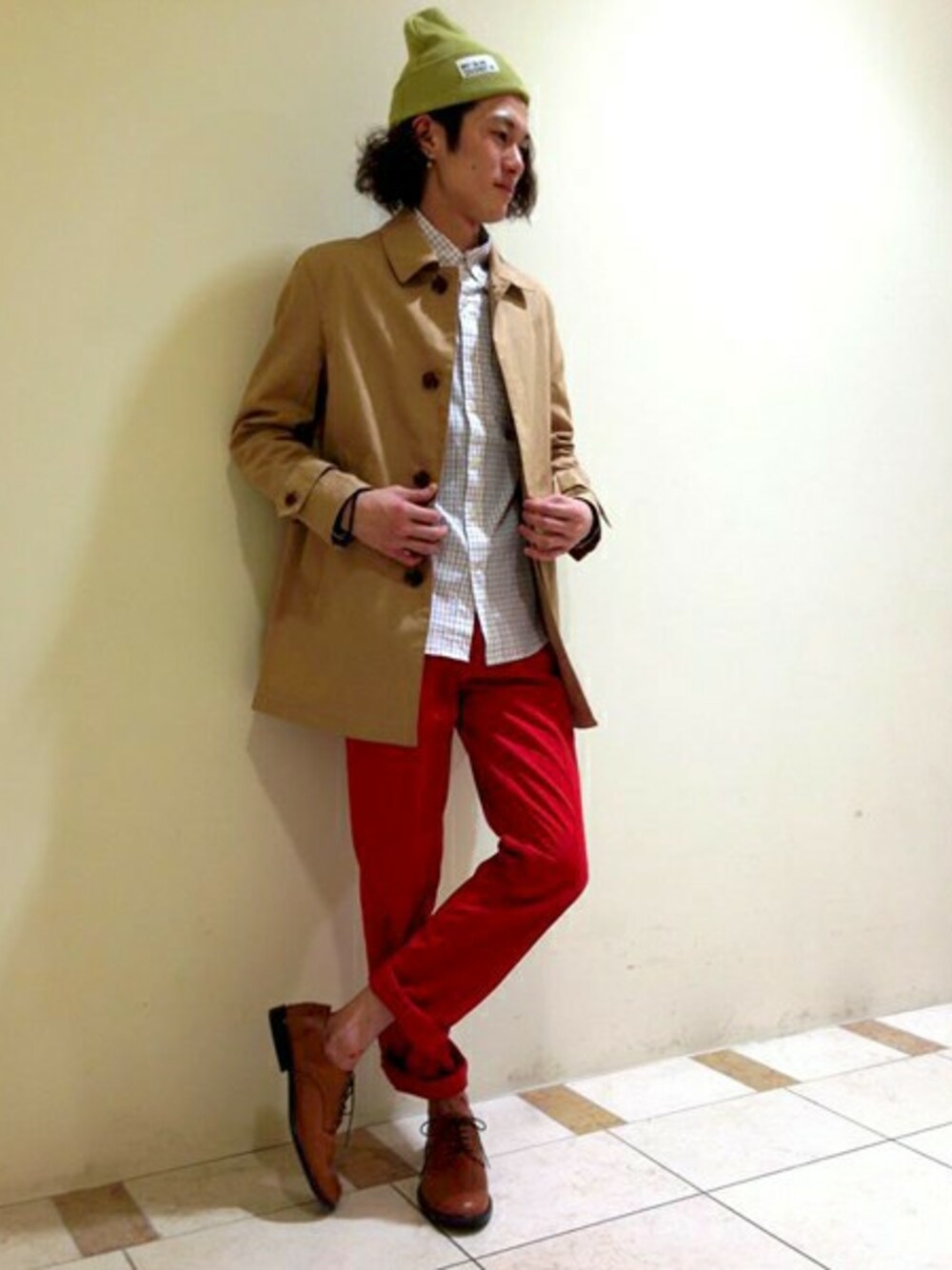 スリムなベージュのスプリングショップコートには、細身のパンツをコーディネート。カラーはベージュと相性の良いレッドをチョイスしました!!
