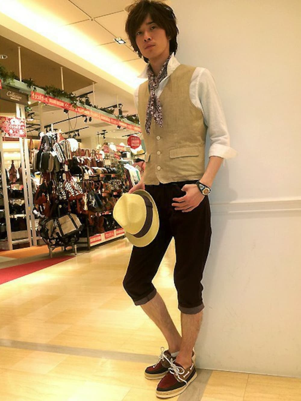 チバタクヤのベスト「<「smart6月号」掲載 成宮寛貴さん着用商品>シャンブレーリネンベスト(ジレ)」を使ったコーディネート