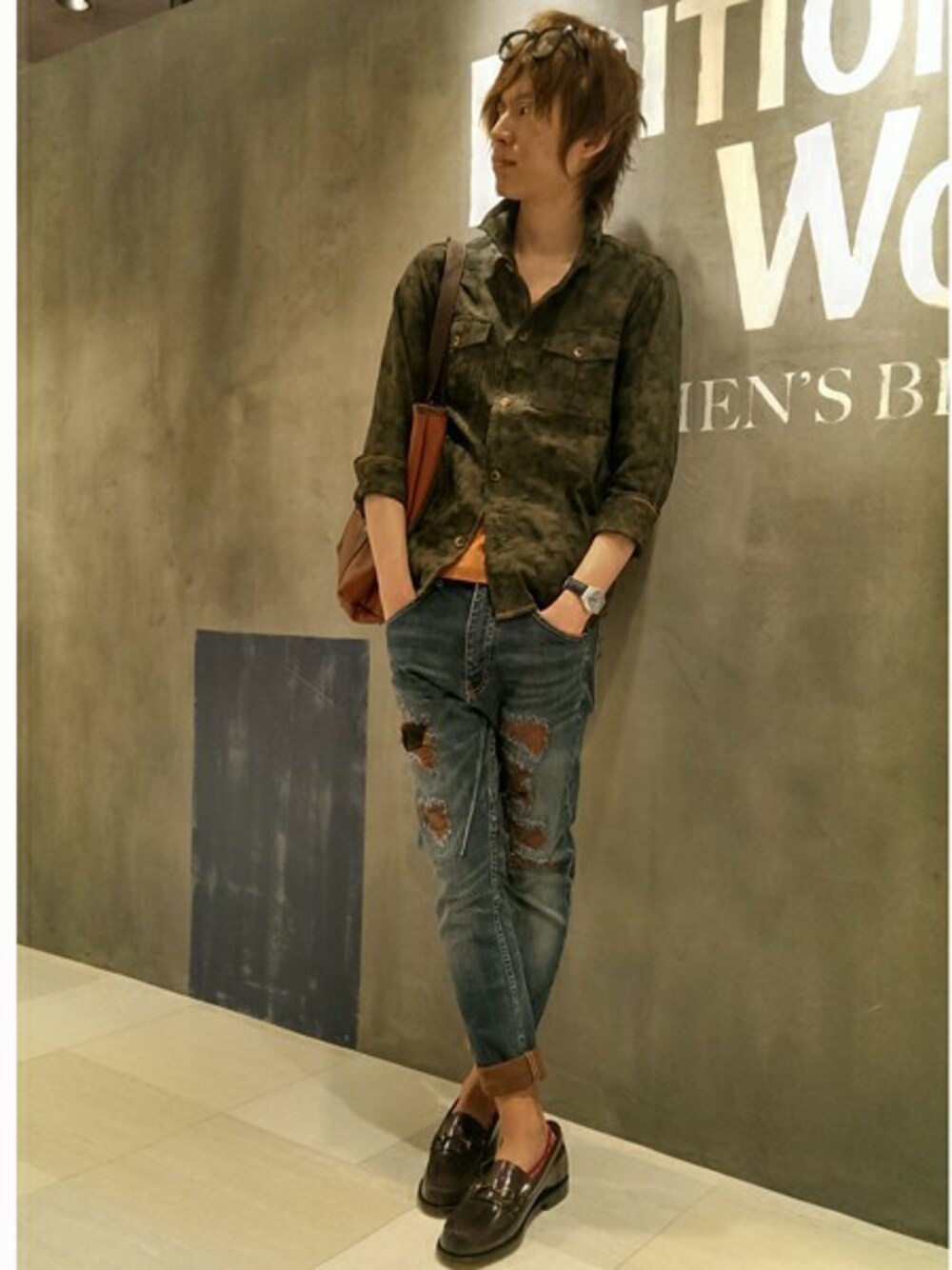 エディションワークス 札幌パルコ店の泉です。 迷彩柄のシャツに、ストレッチのデニムパンツをコーディネート。全体的にスリムになるようにまとめました!!