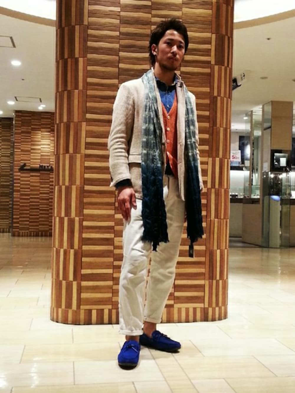 ブルーをベースカラーにナチュラルなベージュやオレンジを差し色にスタイリング。 大人の休日コーデをイメージしました。 ビビッドな色合いのトップスにホワイトパンツで軽さを出すのが今年らしいですね。