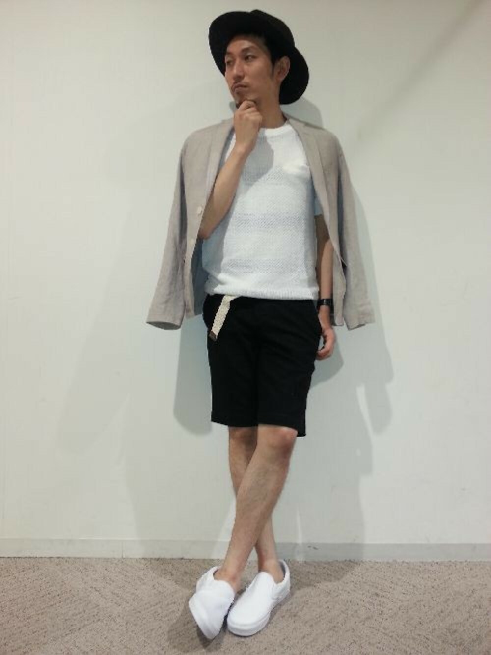 モダンマリンスタイルをイメージしました。 モノトーンを基調に、ロングブリムハットとあえて肩掛けしたジャケットでヌケ感を。 ボーダーTシャツに半袖サマーニットをレイヤードしてボーダーに控えめにアレンジ。