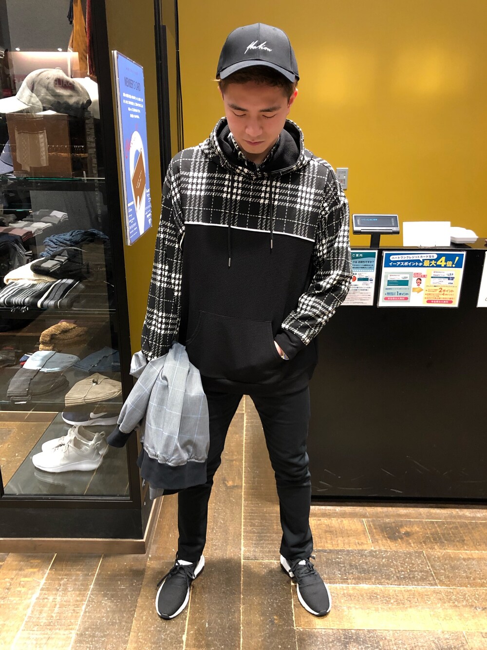 USイーアスつくばのパーカー「チェックスウィッチングパーカー」を使ったコーディネート