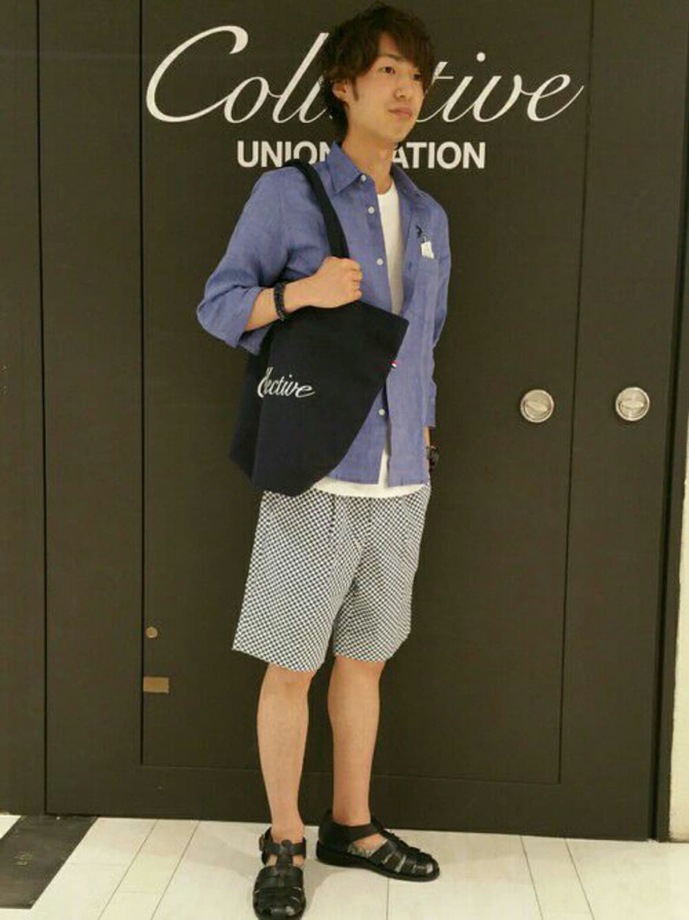 こんにちは〜名古屋パルコ コレクティブです(^^)/ 蒸し暑い日を涼しく爽やかに過ごせるアイテムを使った爽やかコーディネートをご紹介致します! ブルーのリネンシャツにショートパンツスタイルだけだと普通ですよね(¯―¯٥) そこでショートパンツを柄物にしてみては? 柄物と言っても、花柄やリゾートテイストではなく市松模様のジャポニズム(≧∇≦)b 無地や花柄系のショートパンツに飽きはじめた方今年は和柄に挑戦してみては如何ですかʕ•̀ω•́ʔ✧