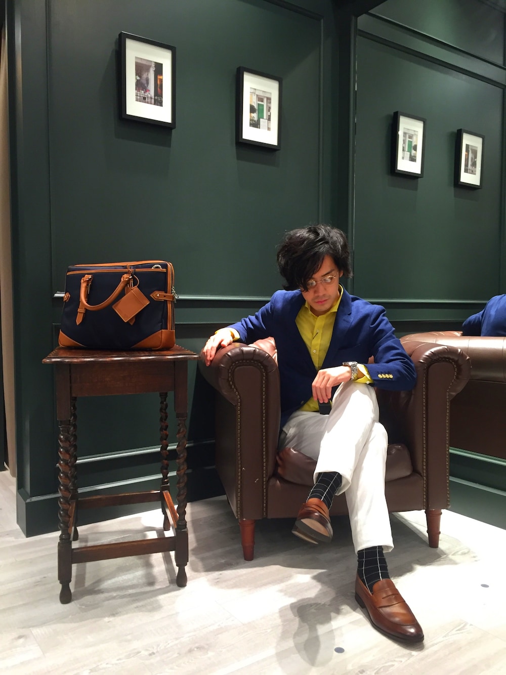 テーマは「WAITING TIME」 紺ブレ、白パンという王道ジャケパンスタイル。 シャツはイエローをチョイスし軽さと華やかさを演出。 足元はキャメルのローファーで気品をプラス。