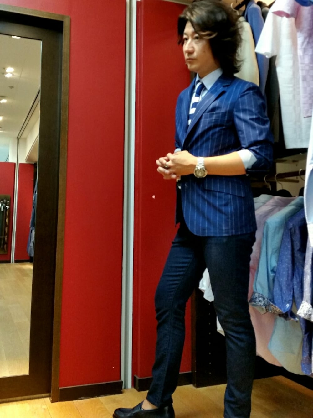nishiのテーラードジャケット「超軽量 ネイビーストライプジャケット/クールドッツ」を使ったコーディネート