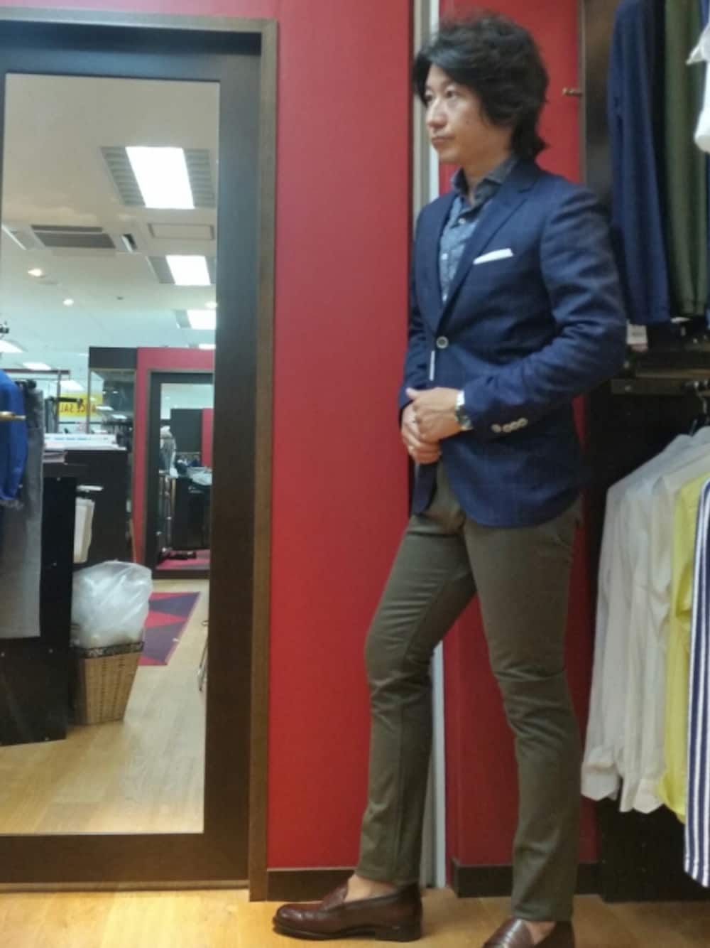 ネイビーのジャケットにカーキのパンツを合わせてみました。ジャケットのインナーには麻混のシャツを合わせています。