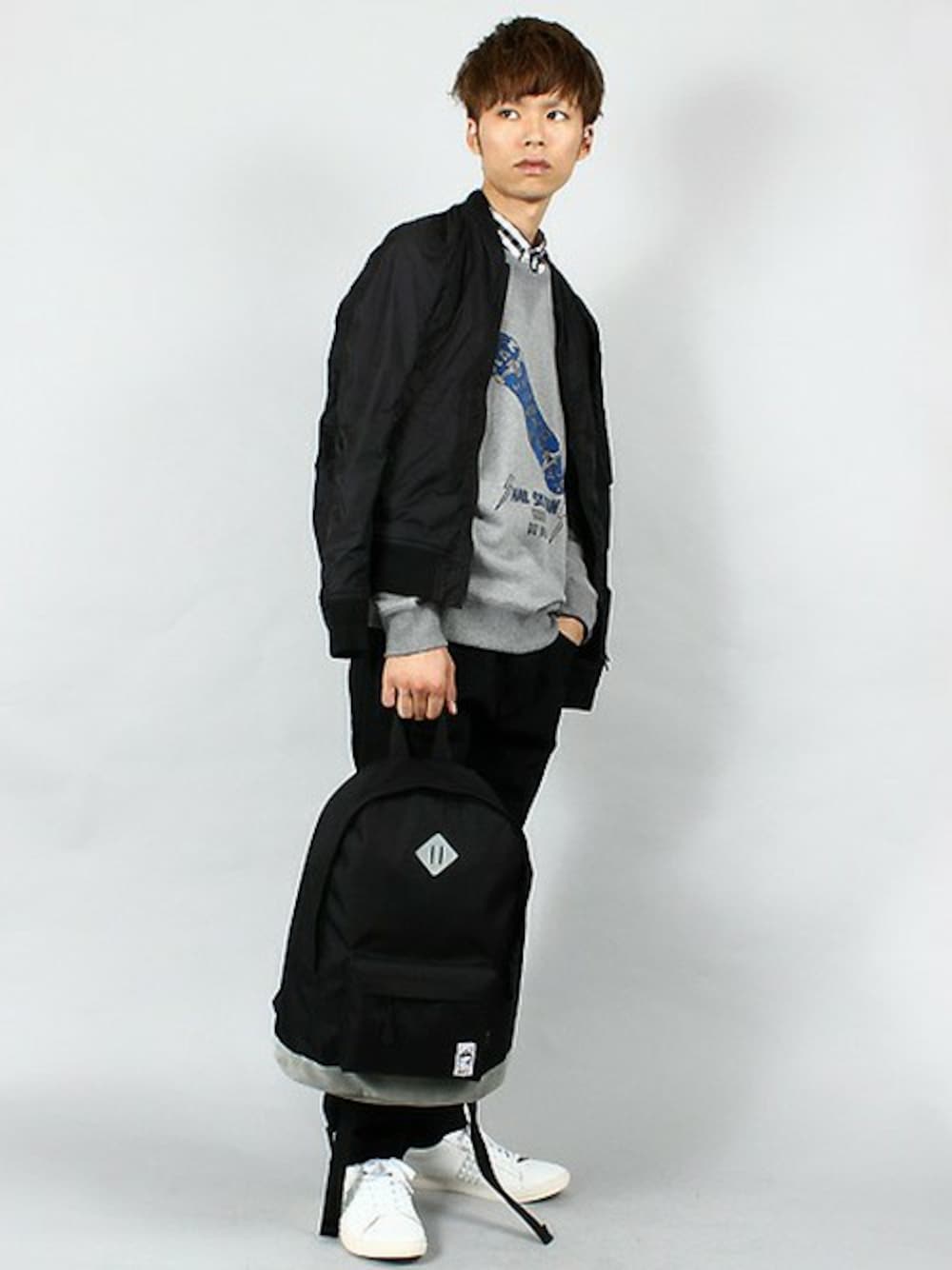 今秋冬のトレンドカラー「BLACK」をベースにモノトーンカラーでまとめました。 インナーのスウェットはロンドンのアーティスト「ローズ・スタラード」のイラストをプリント。 「90年代のストリート」の代表的なアイテム「スケボー」をモチーフに制作した、アーティスティックな一枚です。