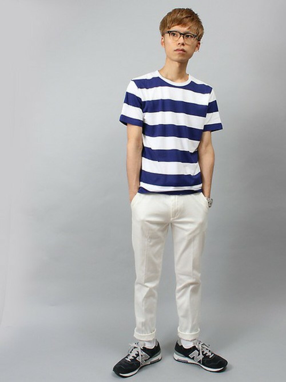 夏の定番「ボーダー柄」もこんな幅広タイプなら グッと新鮮なイメージになりますね。 インナーとしても、トップスとしてもインパクトあり、ですね。