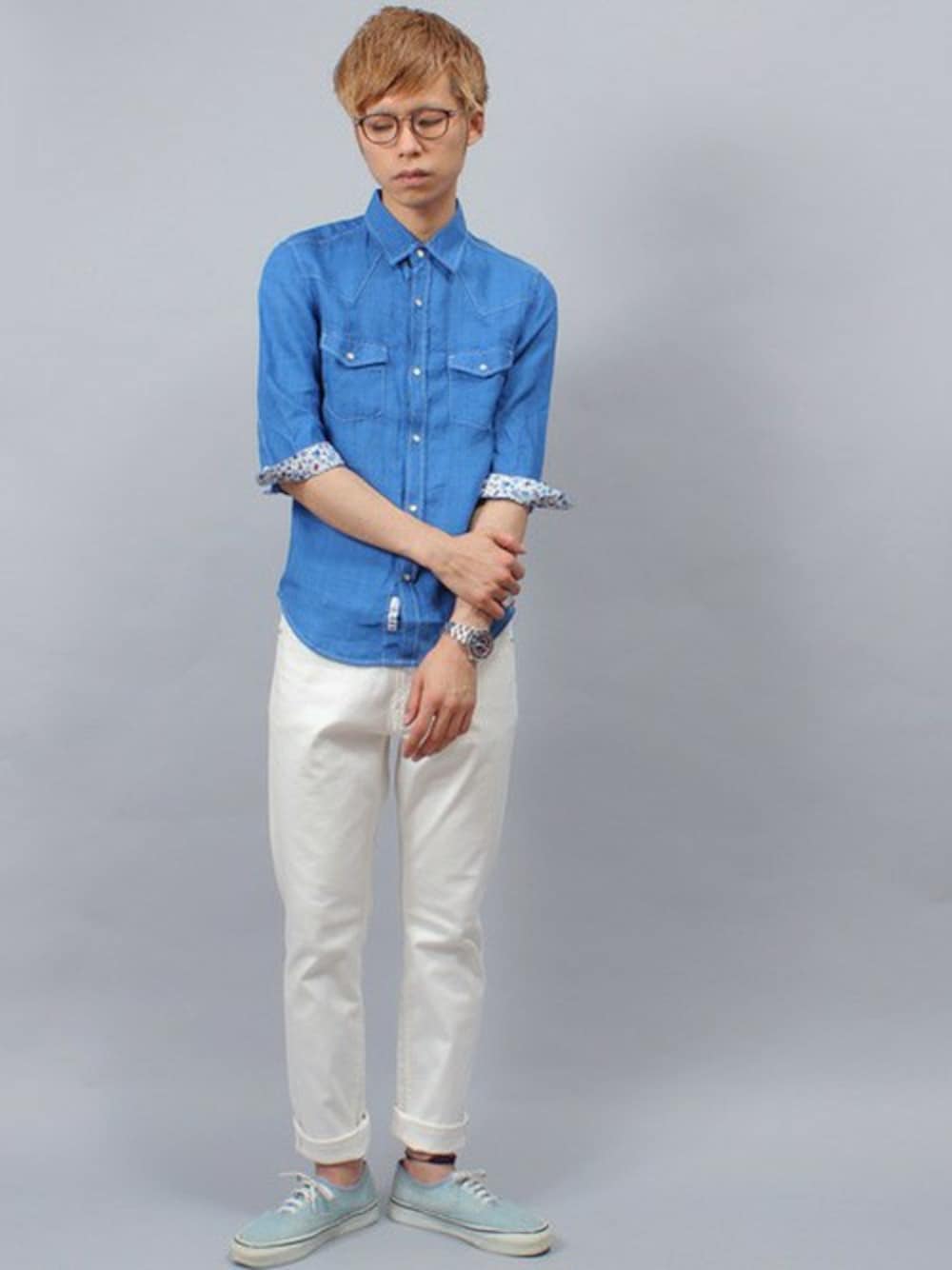 袖裏の花柄がポイントのウエスタンシャツ。 やさしいブルーと相まって、都会的な雰囲気に仕上がりました。 ボトムは今年テッパンの白パンで。