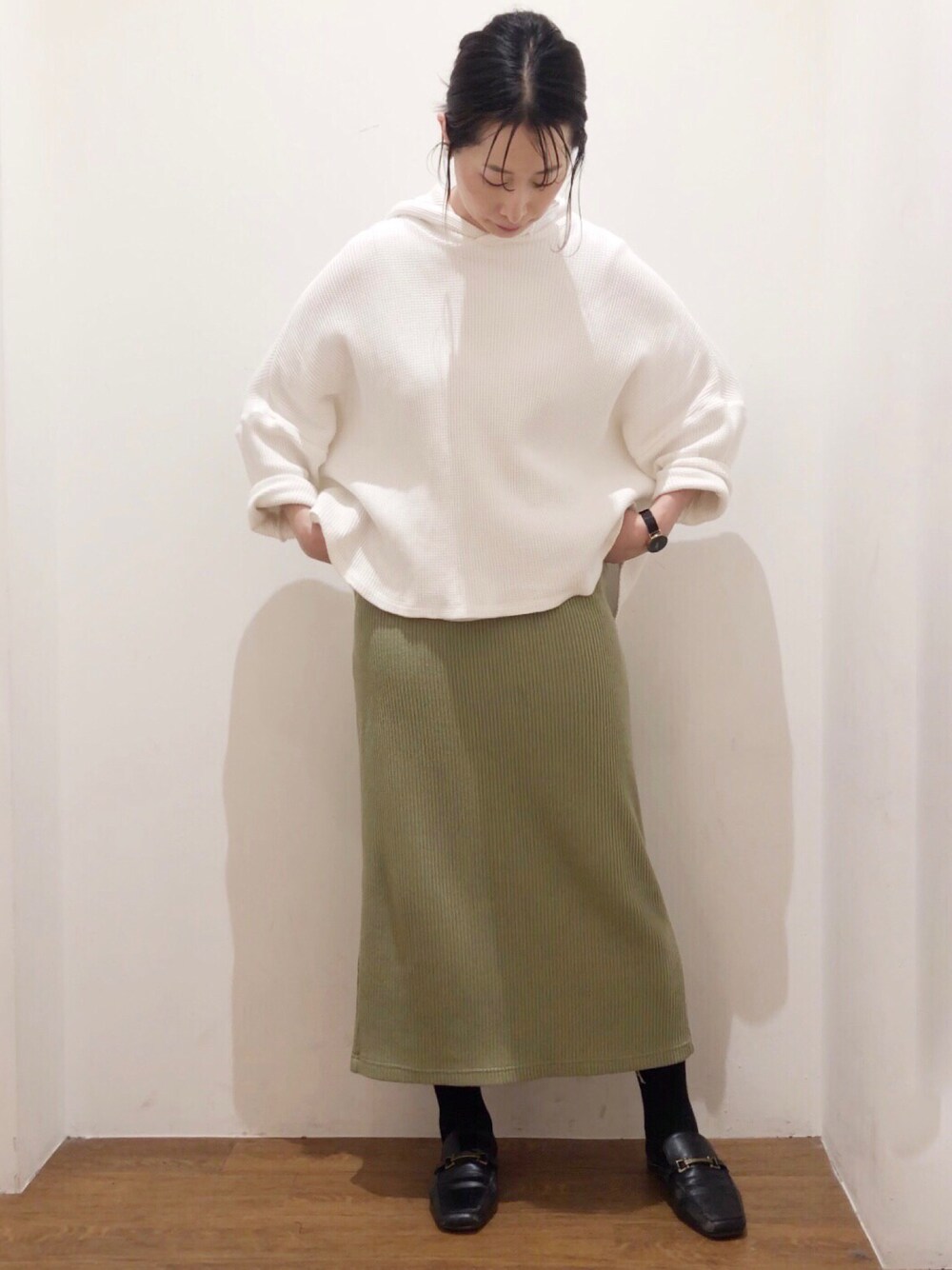 ⚫︎ワッフルポンチョ風パーカー⚫︎ 肌触り良し◎ 後ろ下がりの裾なのでお尻隠せます◎ ⚫︎タイトリブスカート⚫︎ khaki 後ろスリット入り◎ 細長いラインを作ってくれます◎ 🐻❄️🍏