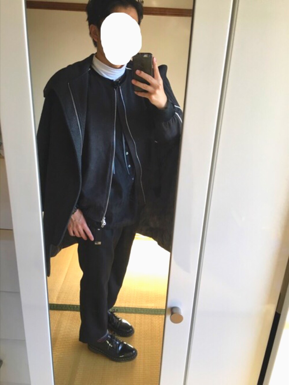 モノトーンでアウターonアウター😎 ノーカラーシャツとノーカラージャケットにタートルネックの合わせ😆 もっと着回せるアウターが欲しい😢