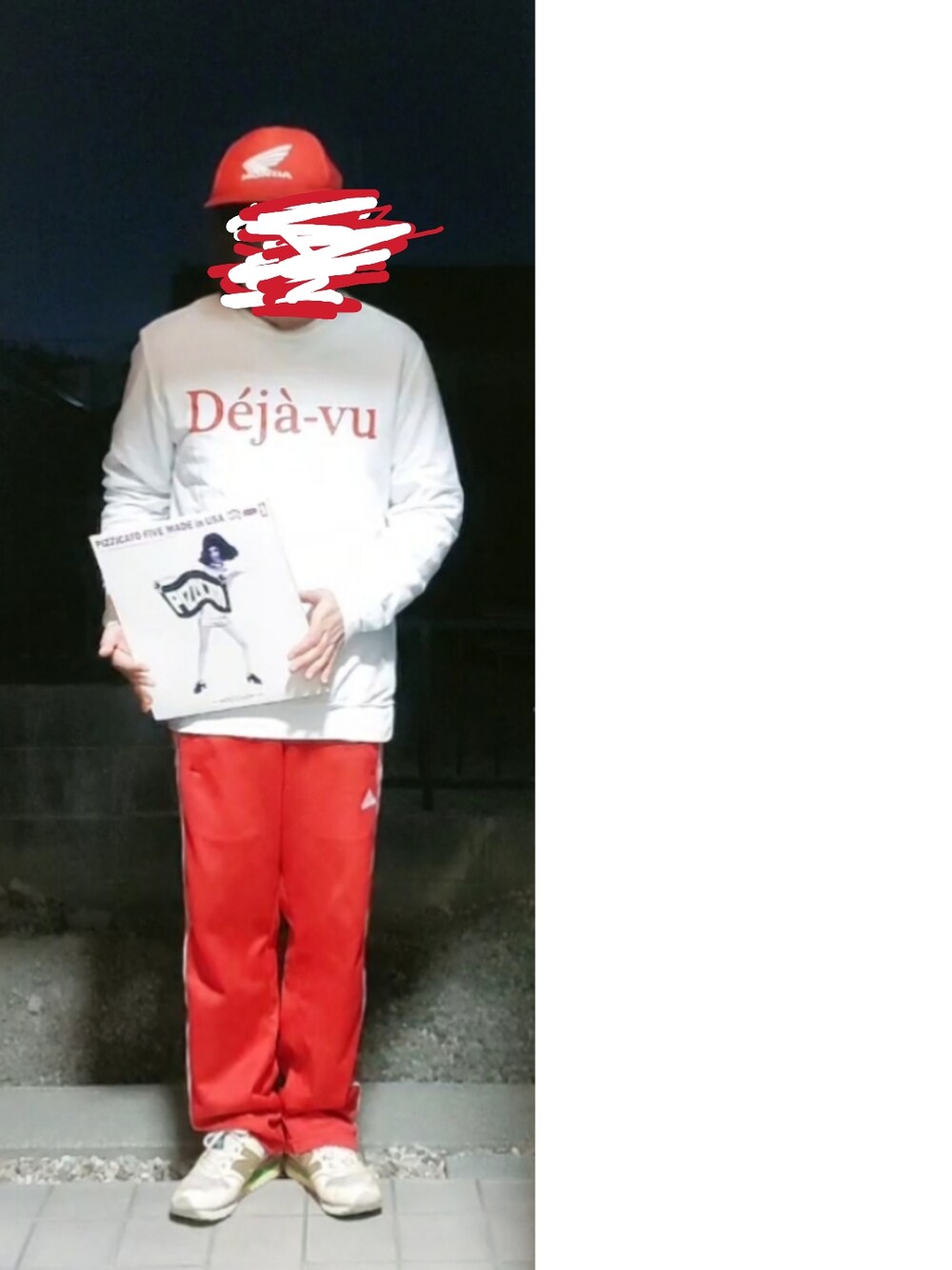 PIZZICATO FIVE 【GO GO DANCER】 見取り図がしそうな 八尾にいるヤンキーがしそうな感じで。 私、来月出産やねん。 出産祝いで、 ミリオンゴットで デジャブフリーズひくわってな感じで。 腰痛をフォローで、 腰と背中にはカイロ装着。 台とりできるように、 足元はnew balanceの996で。