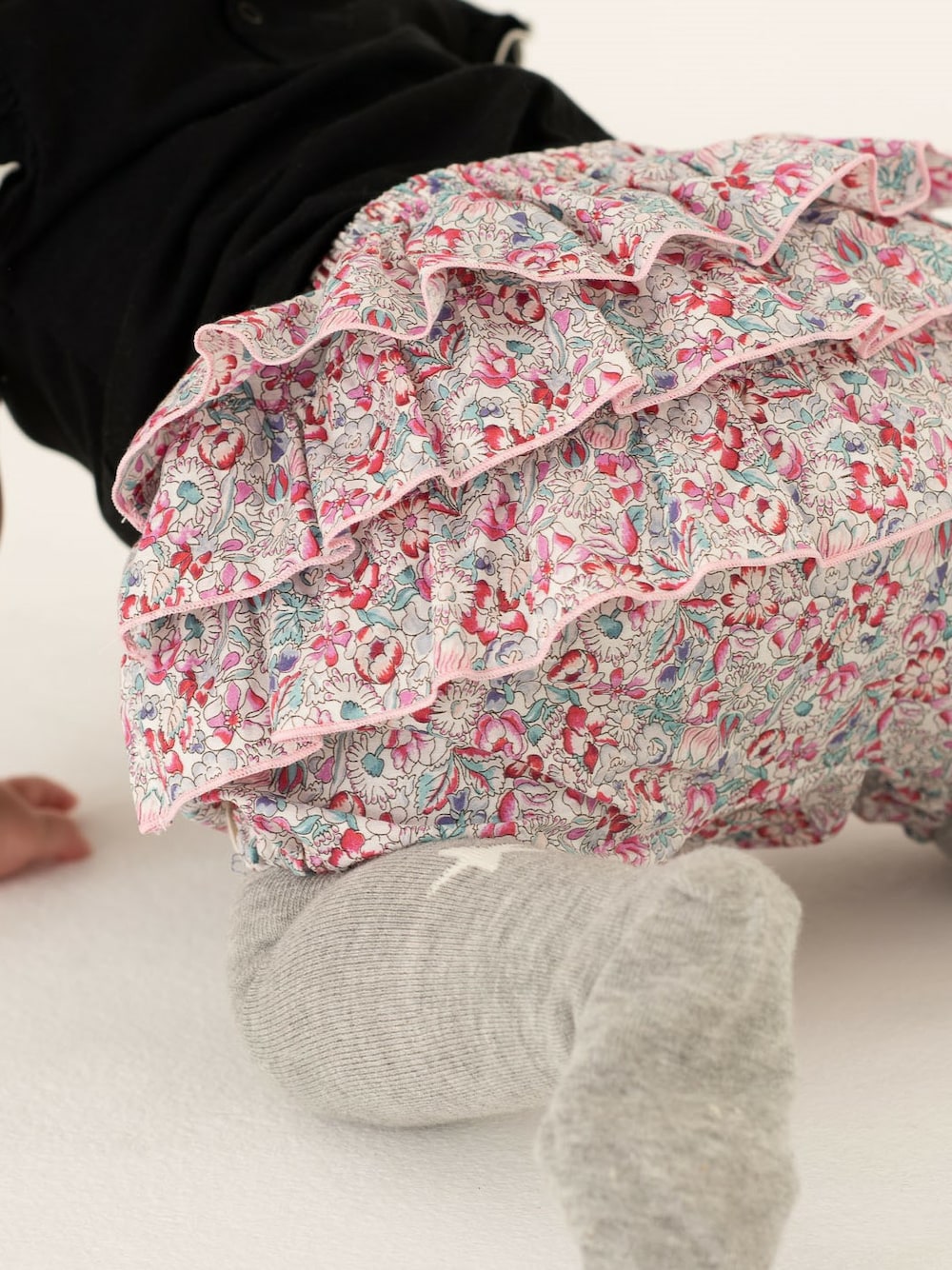 後ろ姿がとってもキュートなおしりフリルブルマ。 履くとスカートのようにも見えるボリュームあるシルエットが人気です。 春夏はボトムとして上にTシャツを合わせて、秋冬はワンピースの下に履いてオムツ隠しにオールシーズンご愛用出来る優れものです。 70~90cmまで幅広いサイズに対応し0歳~2歳まで長く使える優れもので、ギフトにも大変おすすめです。 安心安全の日本製。