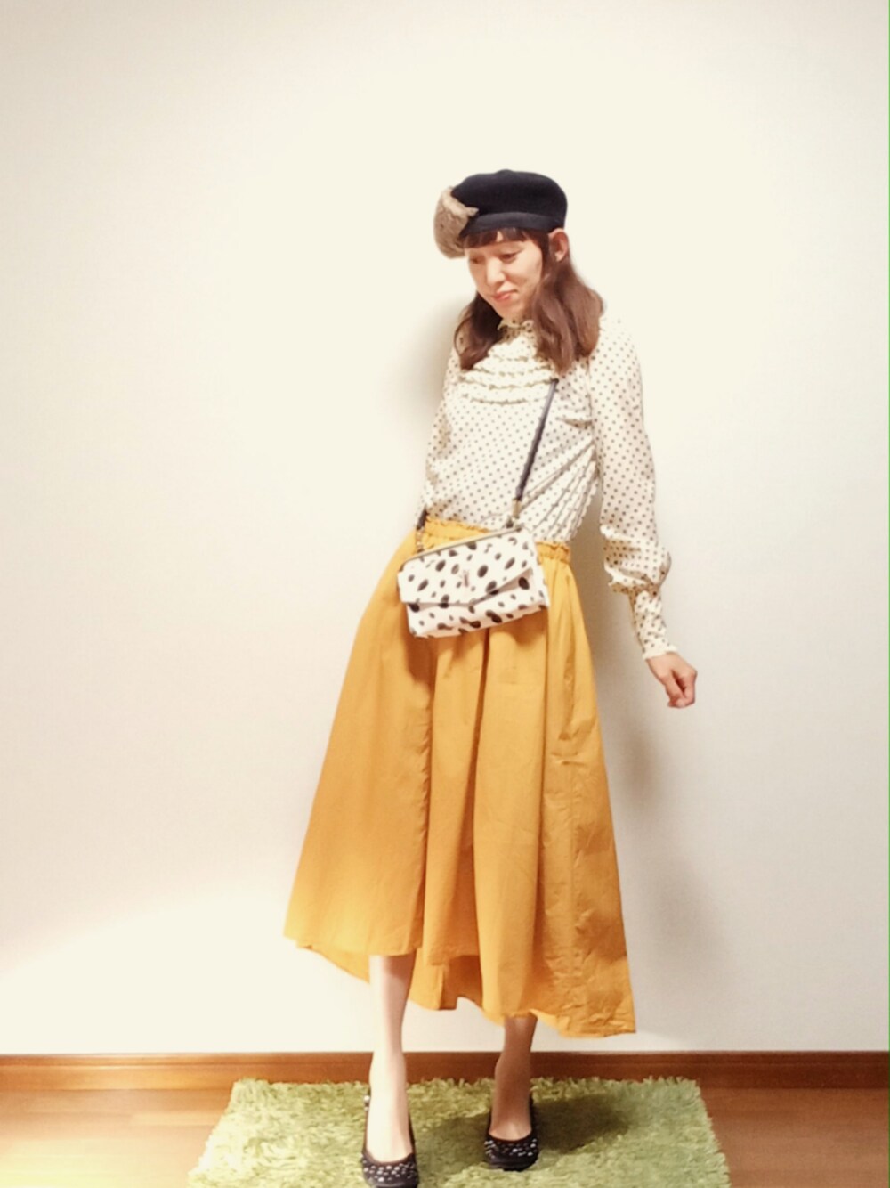 ★昨日と同じブラウスを着回したコーデです。本当は並べて1枚にしようと思ったのですが、ボトムスだけでなくアイテムも総入れ替えだったので、アイテム数オーバーで断念しました🤣💦いつも見に来て下さる皆様には、無駄に連投見させてしまい、申し訳ないです🙇♀️💦また見に来て下さり、ありがとうございます‼️ ★こちらも似たようで非なる『柄トップス×柄小物』。ドット柄とダルメシアン柄になります。更にはパンプスのラインストーンがドットにも見え、ブラウスの袖にキラキラボタンが着いているので、靴とリンクできてまとまった気がします✌️♥️ ★以前も使った帽子なので、マンネリにならぬよう髪型は下ろしてみました🎵昨日のパンツもこのスカートも、夏にも履いた着回しなんですが、素材がオールシーズンで、カラーが秋カラーだと全然使えますね😁✌️ 昨日の柄×柄コーデも、あたたかいコメント、『♡』、📂インありがとうございます🤗✨皆さまのおかげで、コンプレックスもオシャレでなんとかなると思っています😉✨