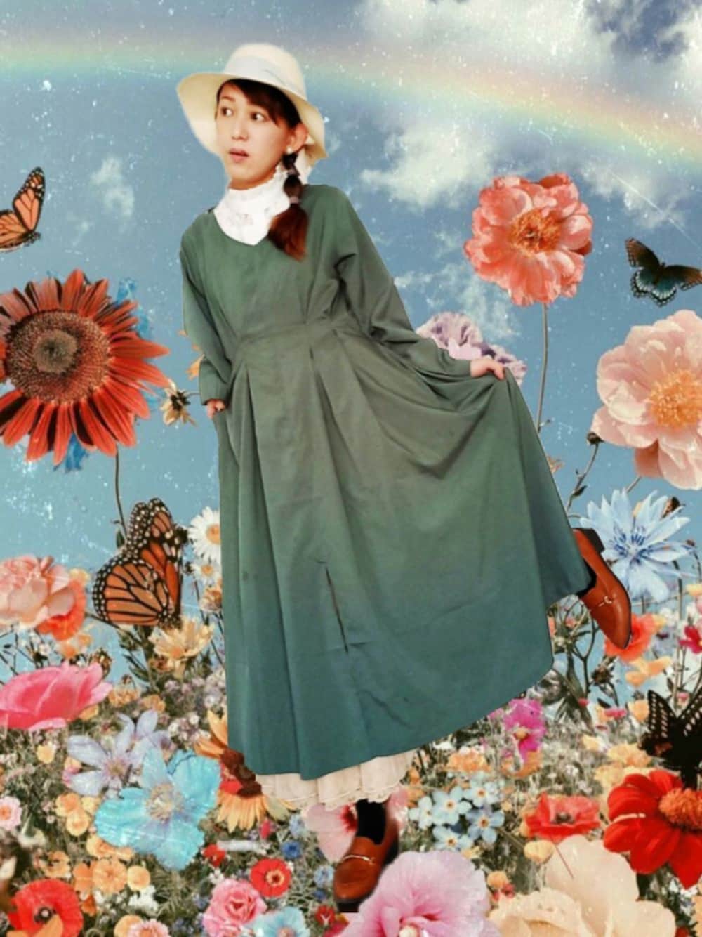 こんばんは🌙✨ 昨日の『ソフィーもどき』を見て下さった方に 御礼申し上げます🙏 WEAR友さん達の #ジブリコラボ が予想以上に クオリティー高くて、あんな衣装も全く似てないの出しちゃって どうしよう😱💦と焦り、苦情受付覚悟でコメ開けたのに、 あたたかい言葉を掛けて頂き、感謝感激でございました🙏💦✨ 今回は前回を省みて、もう少しソフィーに寄せたコーデを…と、 グリーンのVネックワンピの首元に付け襟を仕込み、 スカートの下にはまたピンクのチュールスカートを仕込んで、 少しクラシカルなコーデにしてみました❗ (前回の反省を生かし、黒タイツも履いた😂) 私は髪の毛が細いため、三つ編みをしてしまうとどうしても ヘアスタイルが貧相になるため、三つ編みではなく、 いわゆる『タマネギヘア』にしてボリュームを出しました😂 これで少しはソフィーに近づけたかな?🤣💦 ソフィーは若く独身なのに、とても冷静でしっかりしていて、 ハウルの仲間たちのお母さん的存在ですよね✨ あの内側から人柄が滲み出ている凛とした眼差しに 私も憧れを抱いています😌✨ そんなソフィーを提案してくれたタッキーと、 マルクルとしてコラ画まで作ってくれたひろっちゃに 大感謝✨大窓より素晴らしい小窓を見て下さい💕 こんな楽しいコラボを一緒にしてくれてる皆さんと、 見て楽しんでくれている皆さんに感謝を…☆ 本当はいっぺんに出すつもりで出来なかった もう1役を次の投稿に連投させて頂きます🏷️ (連休中子供がいてバタバタで、まだ皆さんの投稿を 全然見に行けてない上、💬返信も遅くてごめんなさい🙇♀️💦)