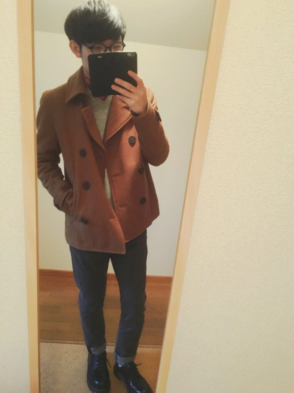 今日はブラウンのピーコートを 使ってコーデしてみました! そうなんです! このコート、写真だとオレンジぽく 見えるけど実はブラウンなんです! ブラウン!トムブラウンのブラウンです! ※トムブラウンのコートではありません笑 全体としては上から、 ニットをグレーでパンツを濃いグレー、 あしもとに黒のマーチンのカラーリング。 そして全体のさし色に赤のネルシャツを。 このコーデの色味、個人的に かなり気に入ってます😊✨ あと、最近ロング丈のコートばっか 着てたので、久しぶりに短いの着ると 逆に新鮮でいいですね😊✨ いつもたくさんのいいね、 SAVE、コメント、フォロー、 ありがとうございます! それでは😆