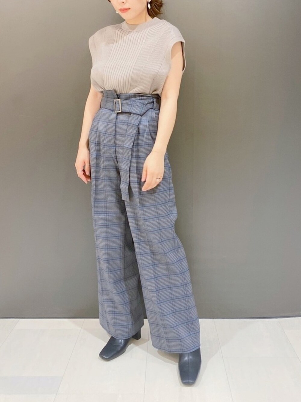トレンドのチェック柄を取り入れてコーディネートしてみました。 継続でベストはトレンドですね! 柔らかい素材で細い縦のラインが入ったベストはエレガントな雰囲気になります。 ONもOFFもOKなコーデです!