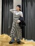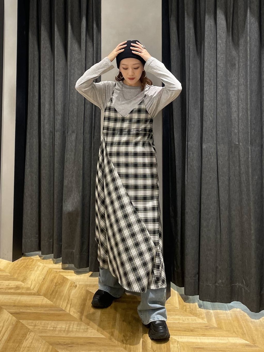 ワンピ 長めのキャミワンピですが丈も好みの長さに調整可能なので身長問わず着れます♪ 6ヶ月妊婦のお腹もすっぽり🤰 チェック柄がコーデの主役になってくれます♡
