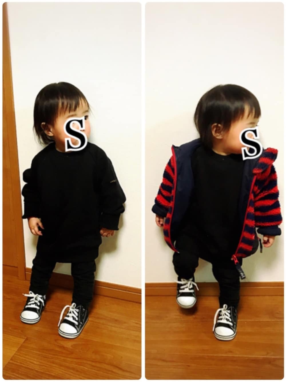 3女ソロデビュー☆ オールブラックコーデ!アウターに赤とネイビーのボーダーを差し色に(^^)姉が写真を撮ってるのを見てるせいか…足とかあげちゃって、一丁前にポーズしてて面白かったですヽ(´▽`)/