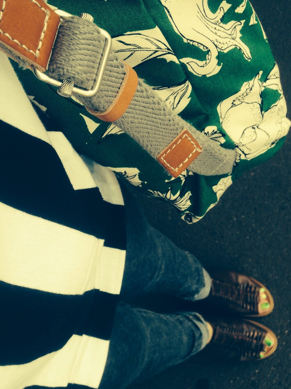 太いストライプ柄のチュニックにレギンスパンツを合わせて。 緑のリュックがお気に入りです。