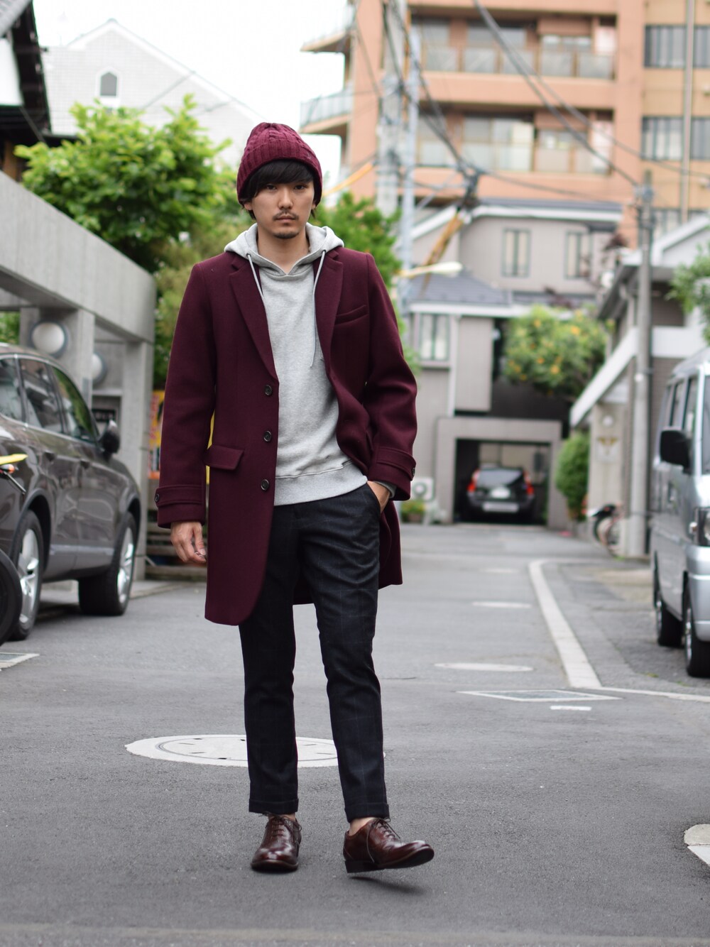 お早うございます 本日は前に紹介したLOUNGE LIZARDのロングコートの色違いのレッドを着てみました!深みのあるボルドー風な赤が目を引きますね。 シルエットがオーセンティックなので軽めなくるぶし丈スラックスにパーカーで頑張り過ぎない大人スタイルが今の気分です。 良い土曜日をお過ごしください!