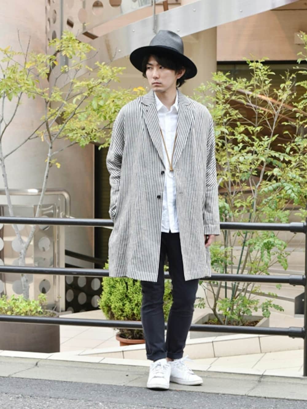 小物で差のつく春のコートスタイル! 「温かくなってもコートが好き!」な方にオススメ。 春や秋の気候にちょうどいいコットン素材のコート。コートながらヒッコリーストライプが軽快な印象です。 インナーのシャツとスニーカーを白にすることで爽やかな雰囲気を演出。 小物にはコートスタイルにハマるロングブリムハットとキーネックレスを合わせて洒落感をプラスしました。 コートスタイルながら程よい抜け感を意識したコーディネートです。 Model:170cm 58kg