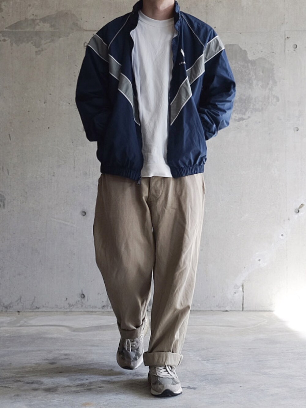 グレー系のスニーカーを着用したメンズの秋コーディネートの1枚目の写真