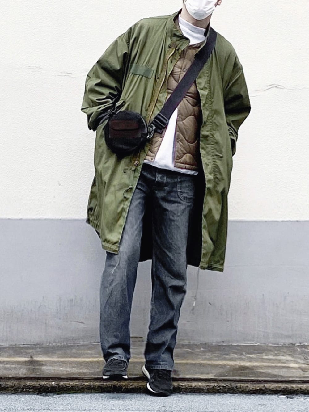 ベージュ系のベスト、ブラック系のショルダーバッグを着用したメンズの冬コーディネートの1枚目の写真